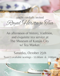 Step back into the elegance of a bygone era with Tea Market at The Museum of Kansas City. Join us for Royal Heritage Tea, a celebration of tradition, taste, and history.